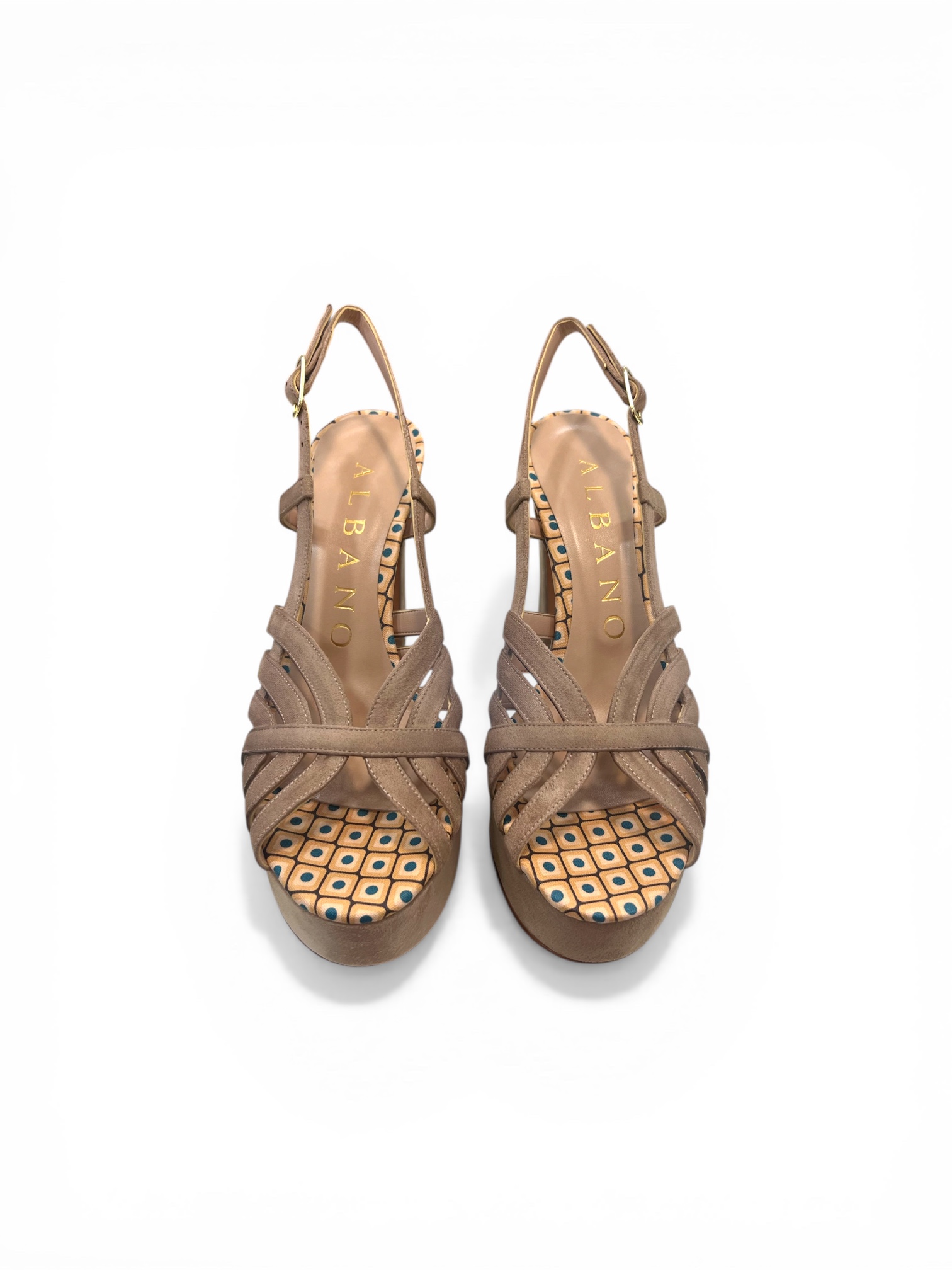 è un sandalo elegante in velour nude , pensato per valorizzare i look più raffinati con uno stile sofisticato. Realizzato 100% Made in Italy, slancia la silhouette con il tacco da 7 cm mentre fibbia oro impreziosisce il design.