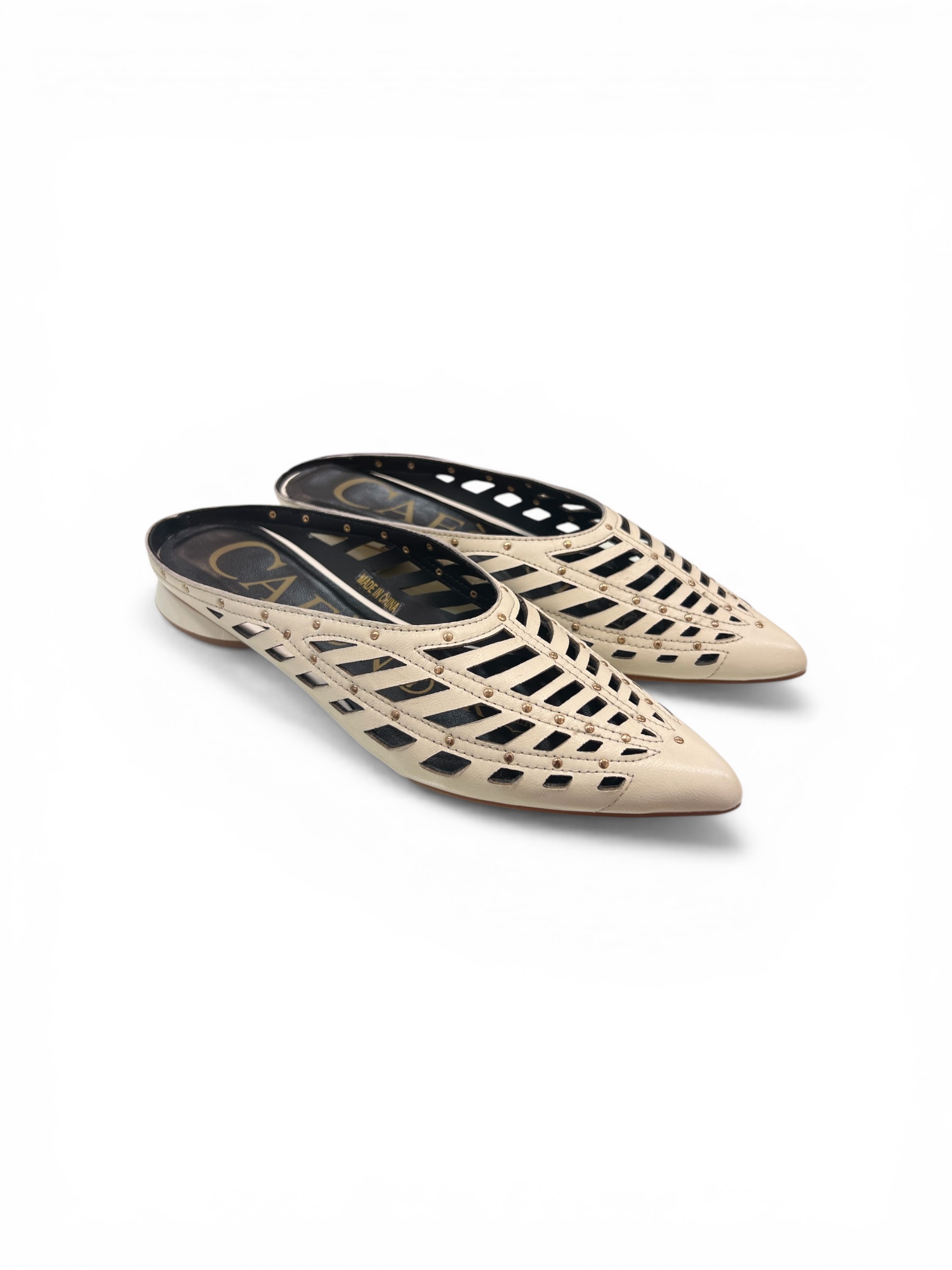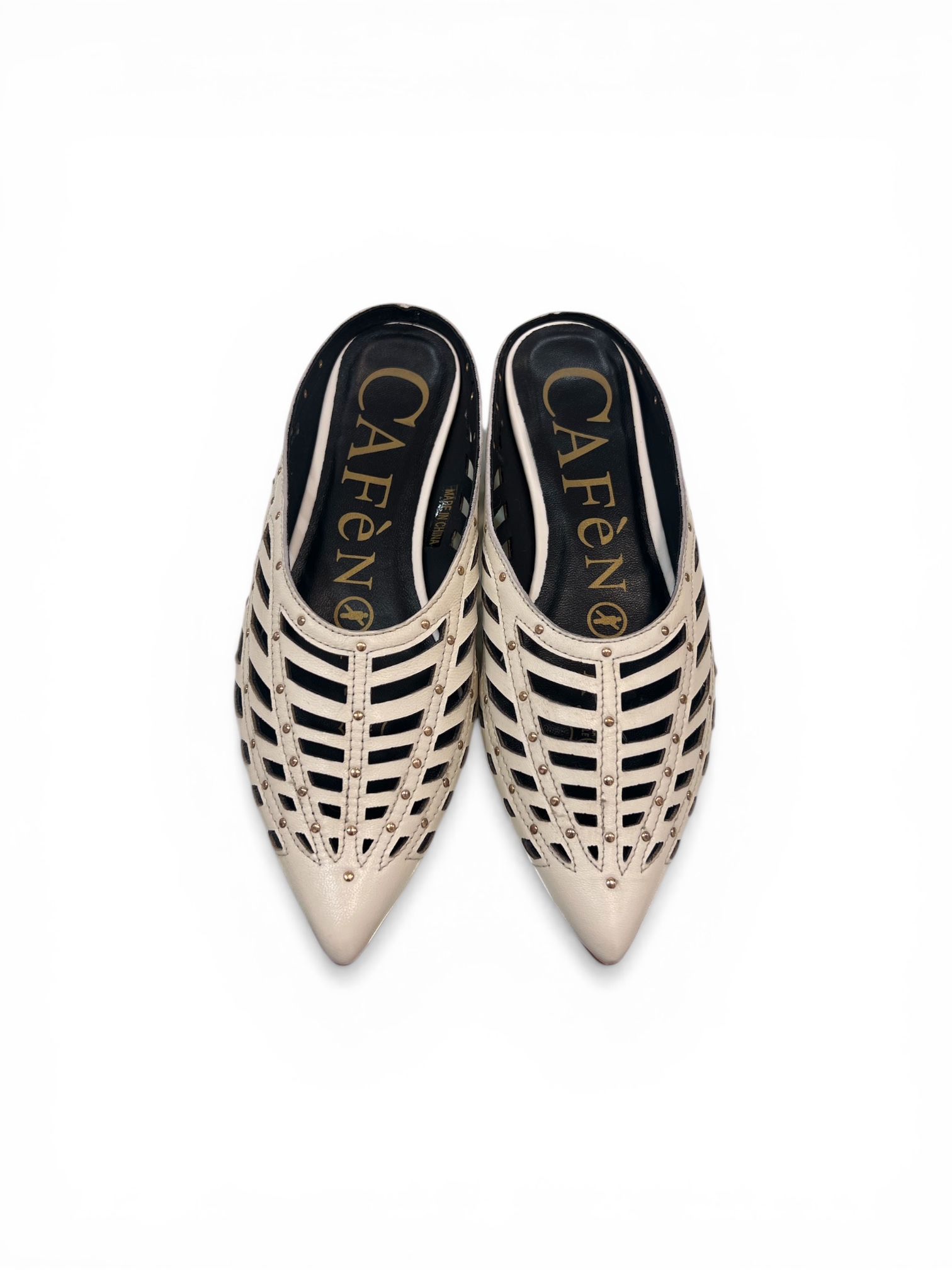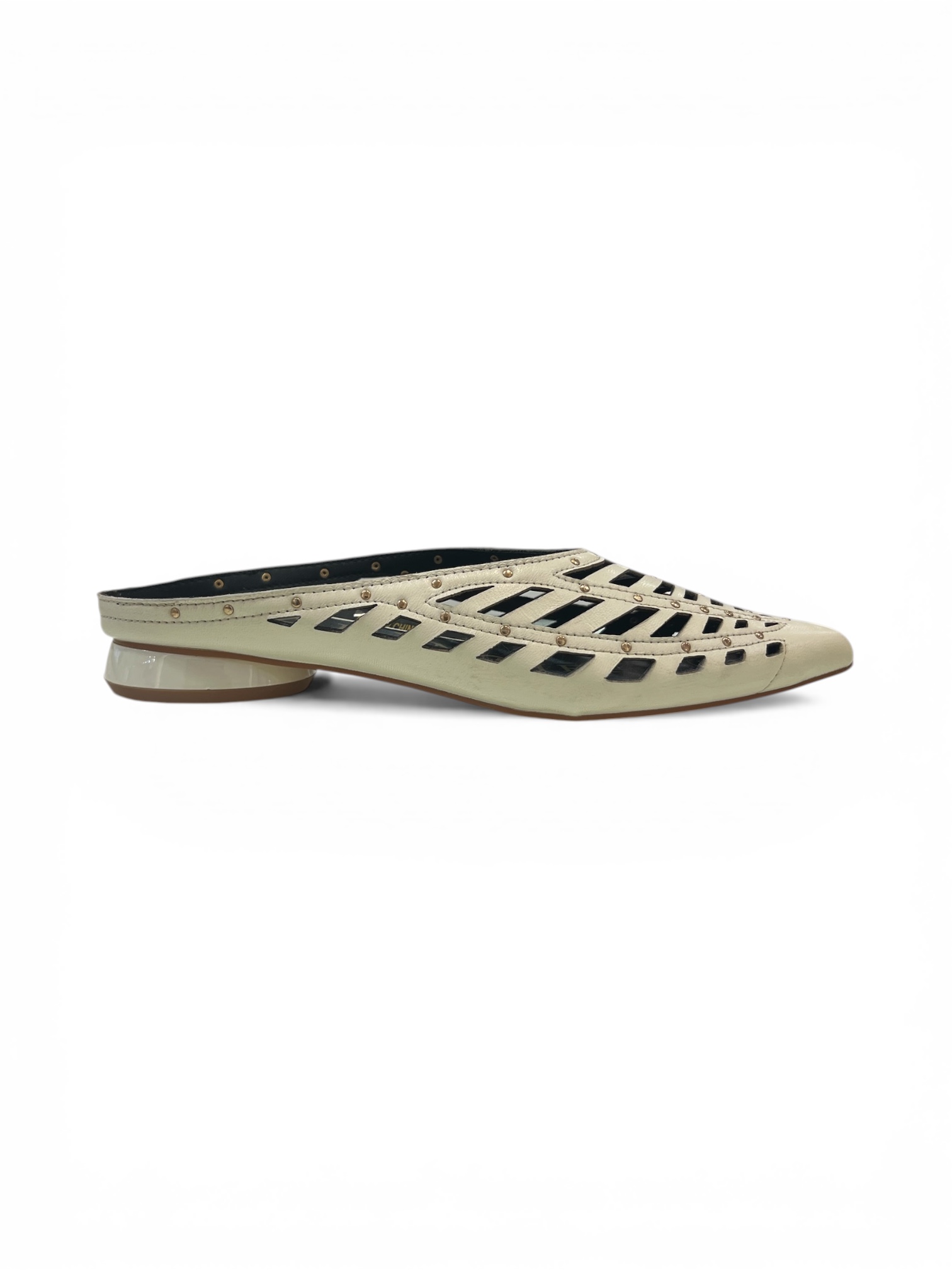 Sabot in nappa bianca traforata con borchie dorate e cinturino regolabile. soletto in pelle per un comfort elevato. tacco da 1.3 cm. look sofisticato e traspirante per l’estate.