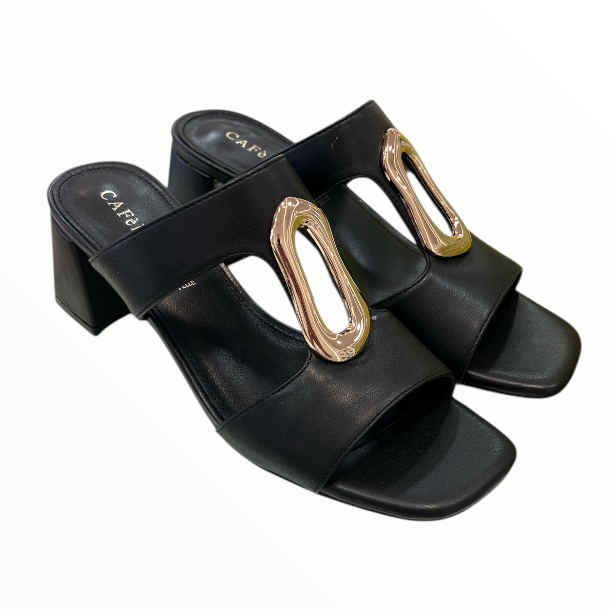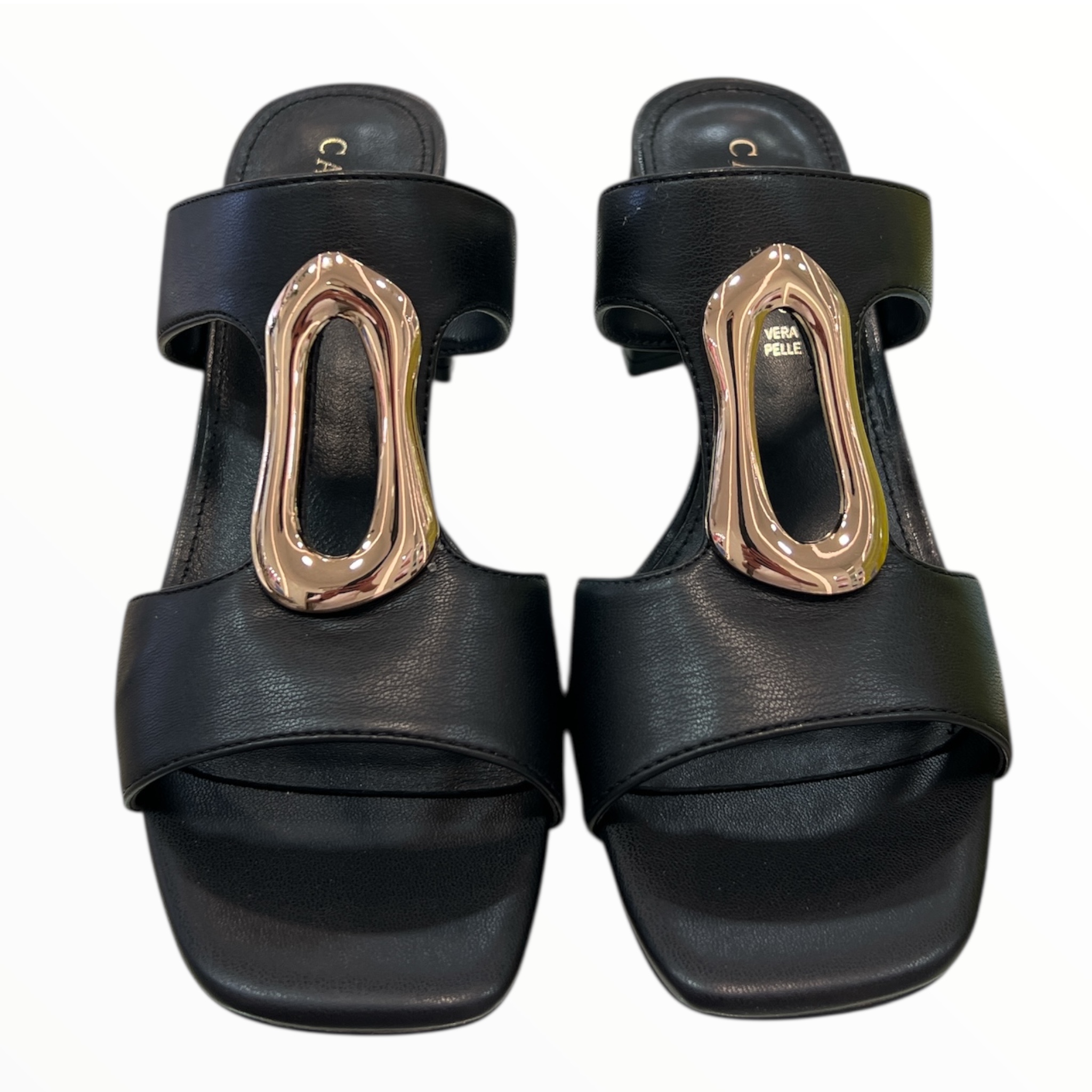 Ciabatta con doppia fascia e accessorio in metallo a decoro. il soletto imbottito in vera pelle fa risultare la calzatura comoda anche dopo svariate ore di utilizzo. il tacco รจ di 6 cm.