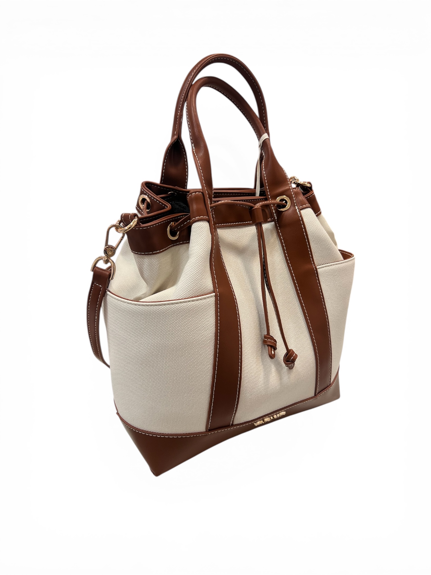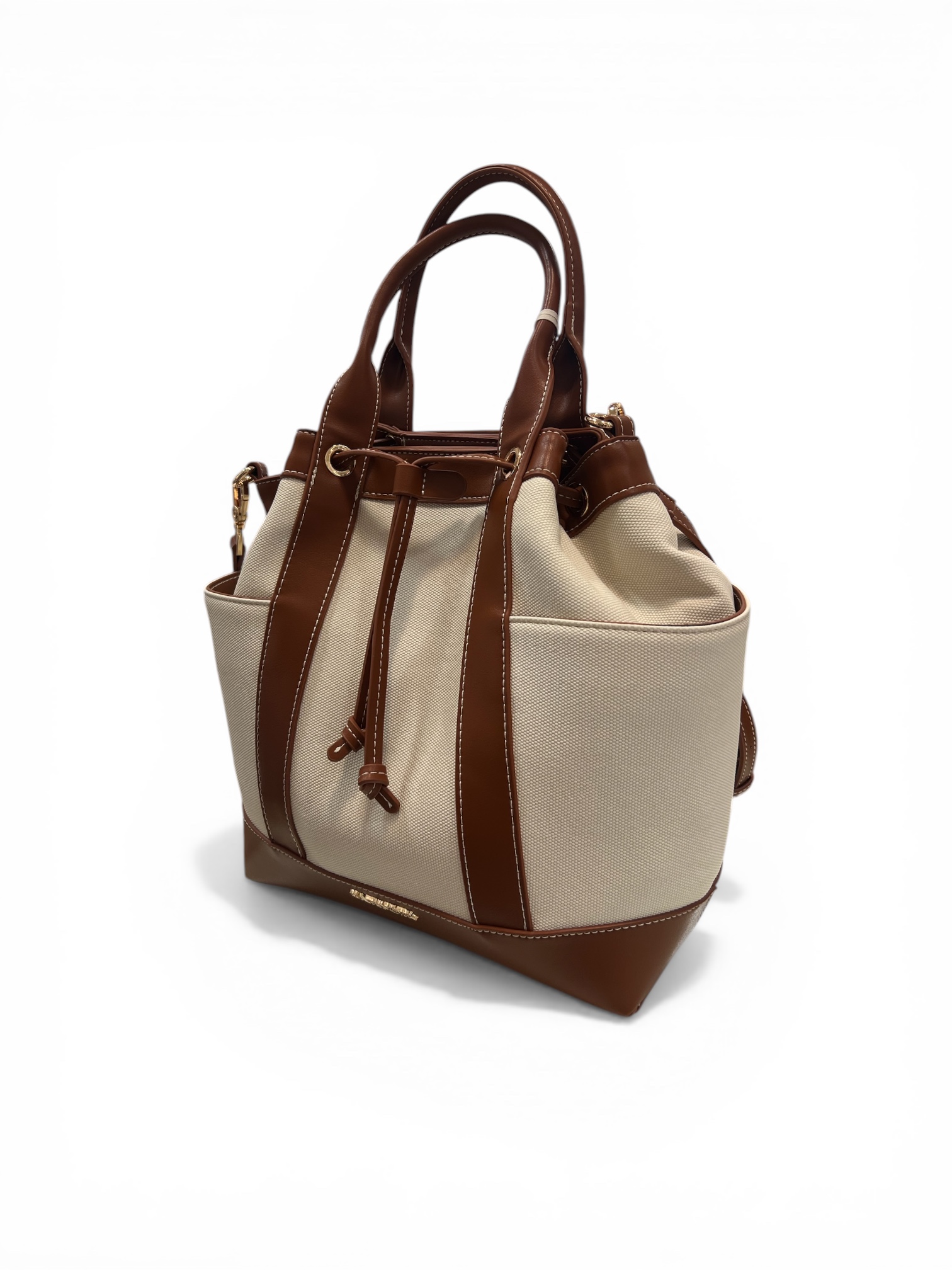 Secchiello con manici effetto canvas e rifiniture effetto pelle in contrasto. design pratico con coulisse vele e stringhe frontali completato da tracolla removibile per uno stile versatile e quotidiano. dimensioni: 36 cm (lunghezza) × 29 cm (altezza) × 12 cm (profondità)