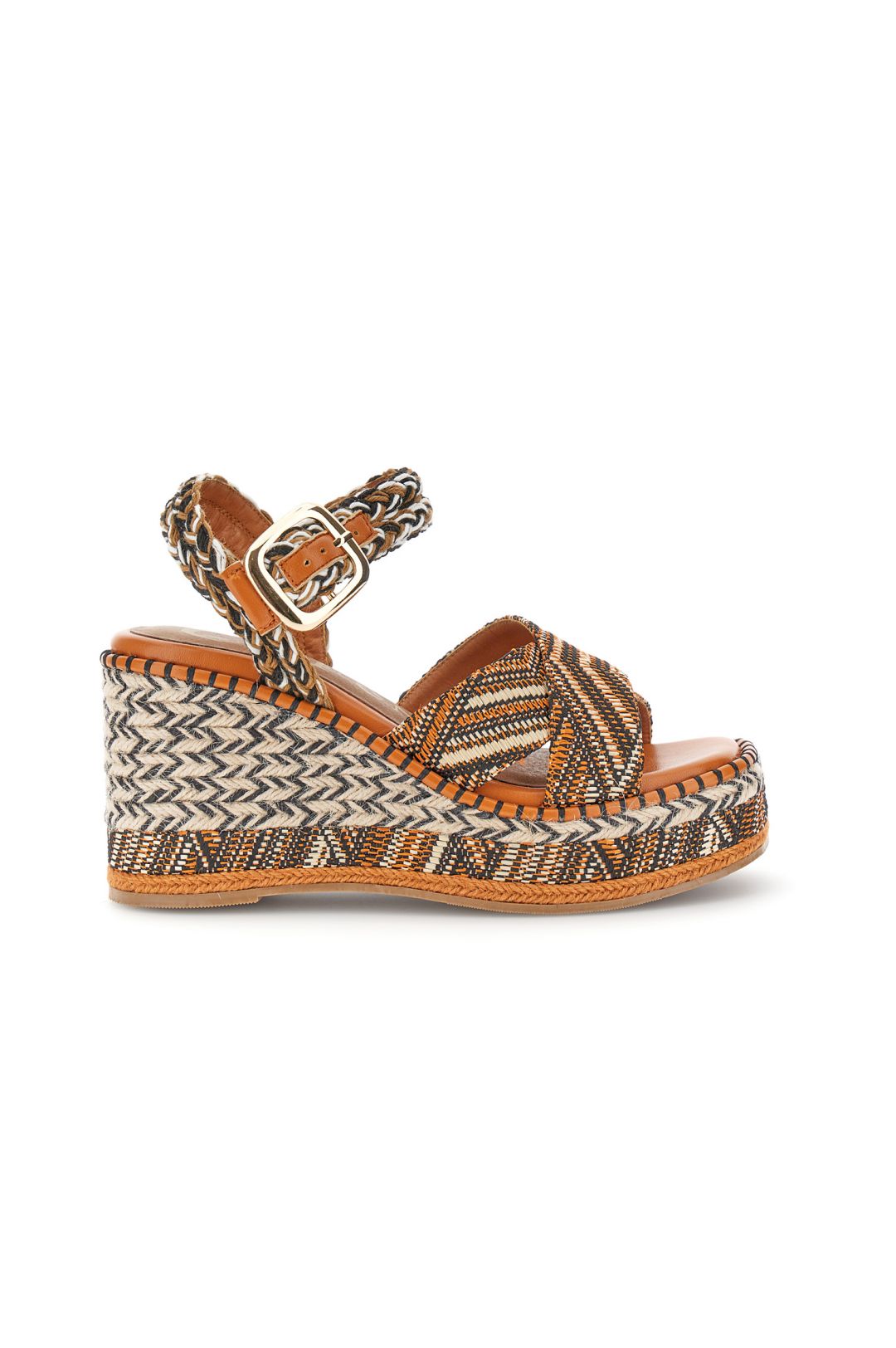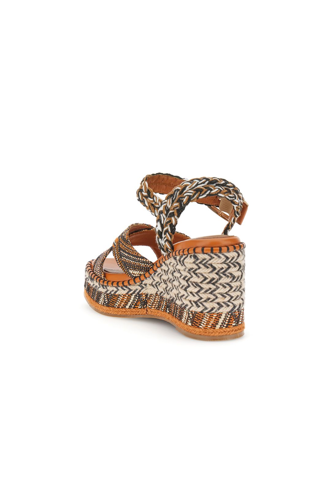 Sandali modello gilda in tessuto con zeppa fasciata alta 9.5 cm. eleganti e confortevoli donano slancio e stile a ogni look estivo. perfetti per outfit casual chic e serate estive con un tocco raffinato e glamour.