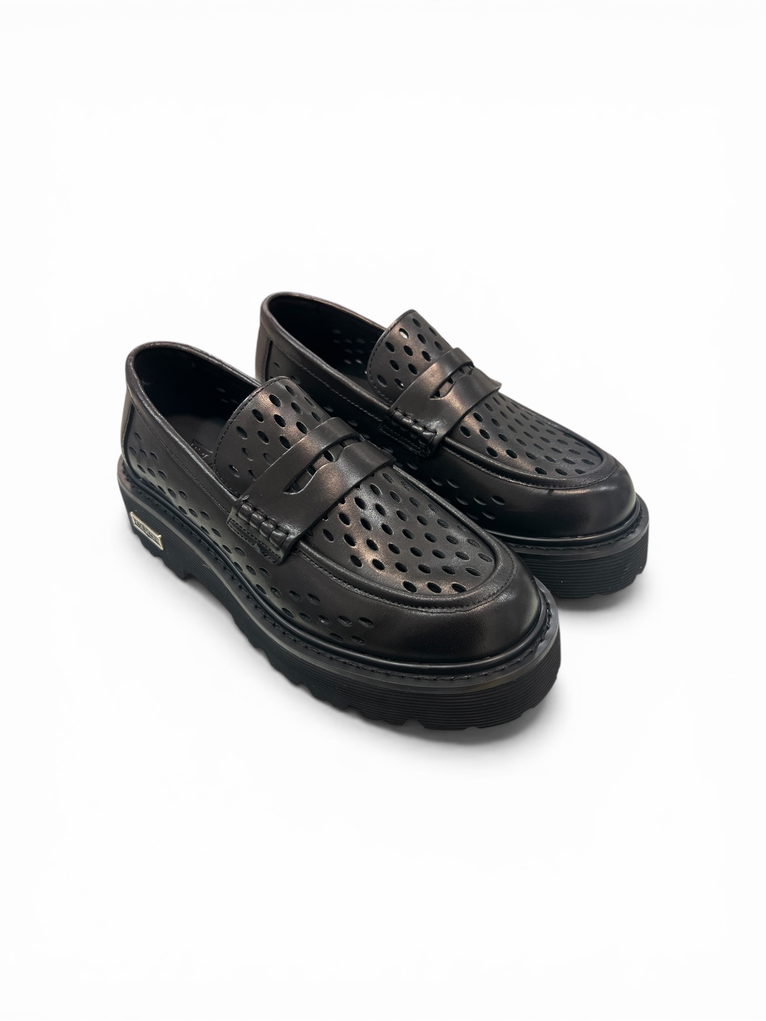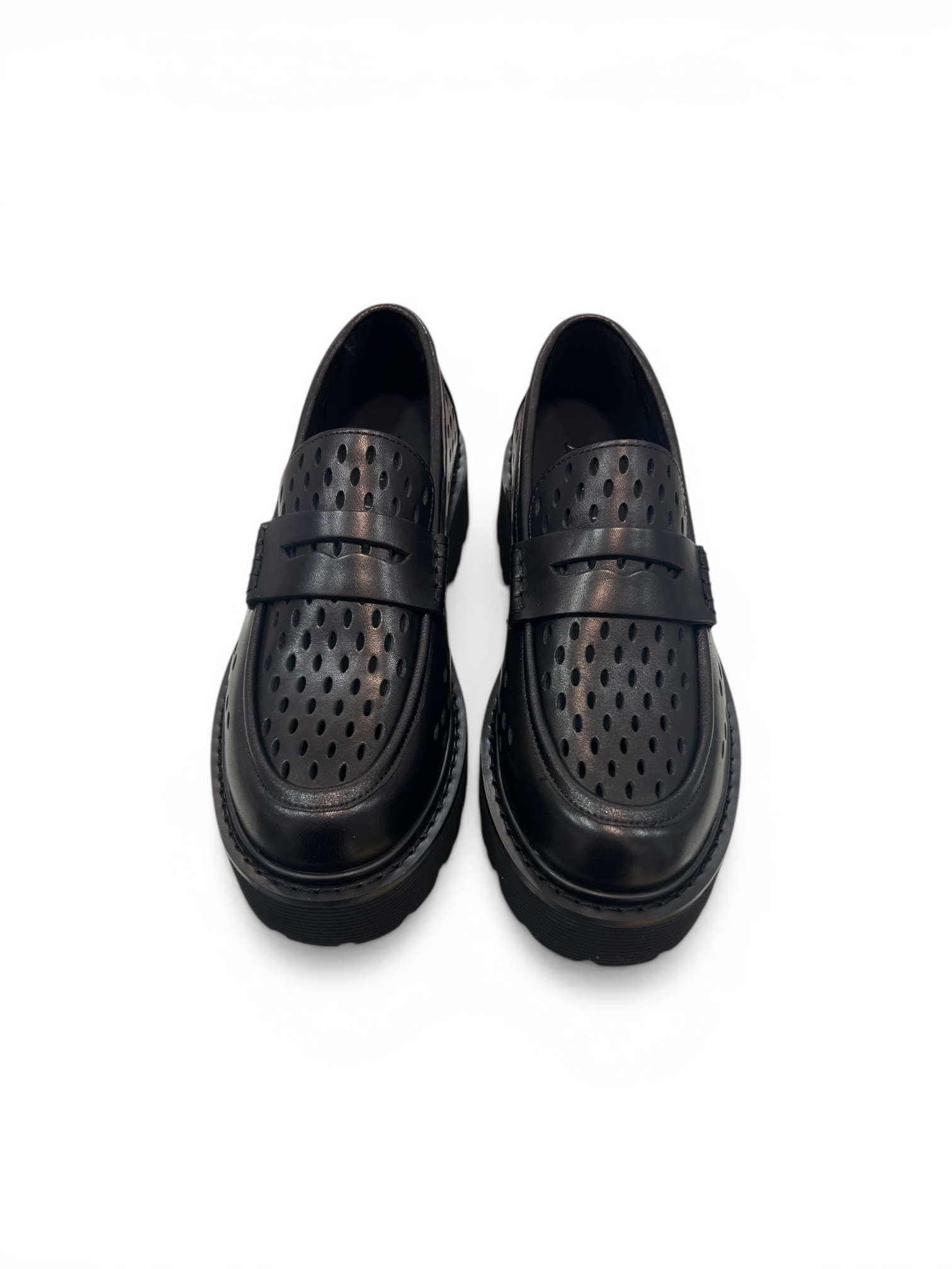 L’eleganza si fa audace: questa stringata in pelle nera stupisce con un design forato all-over che fonde traspirabilità e stile. La maxi suola platform carrarmato completa il look, offrendo un’attitudine indipendente e decisamente glam-rock.