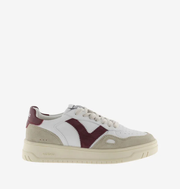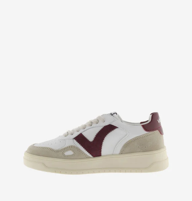 Sneakers unisex in similpelle bianca con inserti colorati e in camoscio. Pannello laterale a “V” in stile vittoriano e pannello sul tallone a contrasto con logo del marchio in tonalità coordinate. Dettaglio laterale a finestra. Punta traforata per una maggiore traspirabilità. Suola in TPR leggermente tostata.