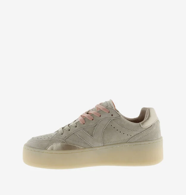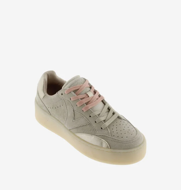 Sneakers platform da donna in pelle scamosciata con inserti metallici tono su tono. Chiusura con lacci bicolore: un paio tono su tono e un altro rosa. Punta traforata per una maggiore traspirabilità. Suola in TPR traslucida color caramello.